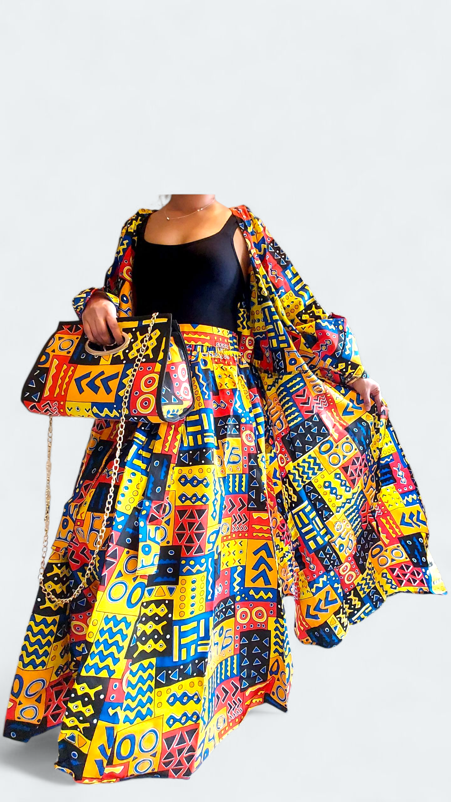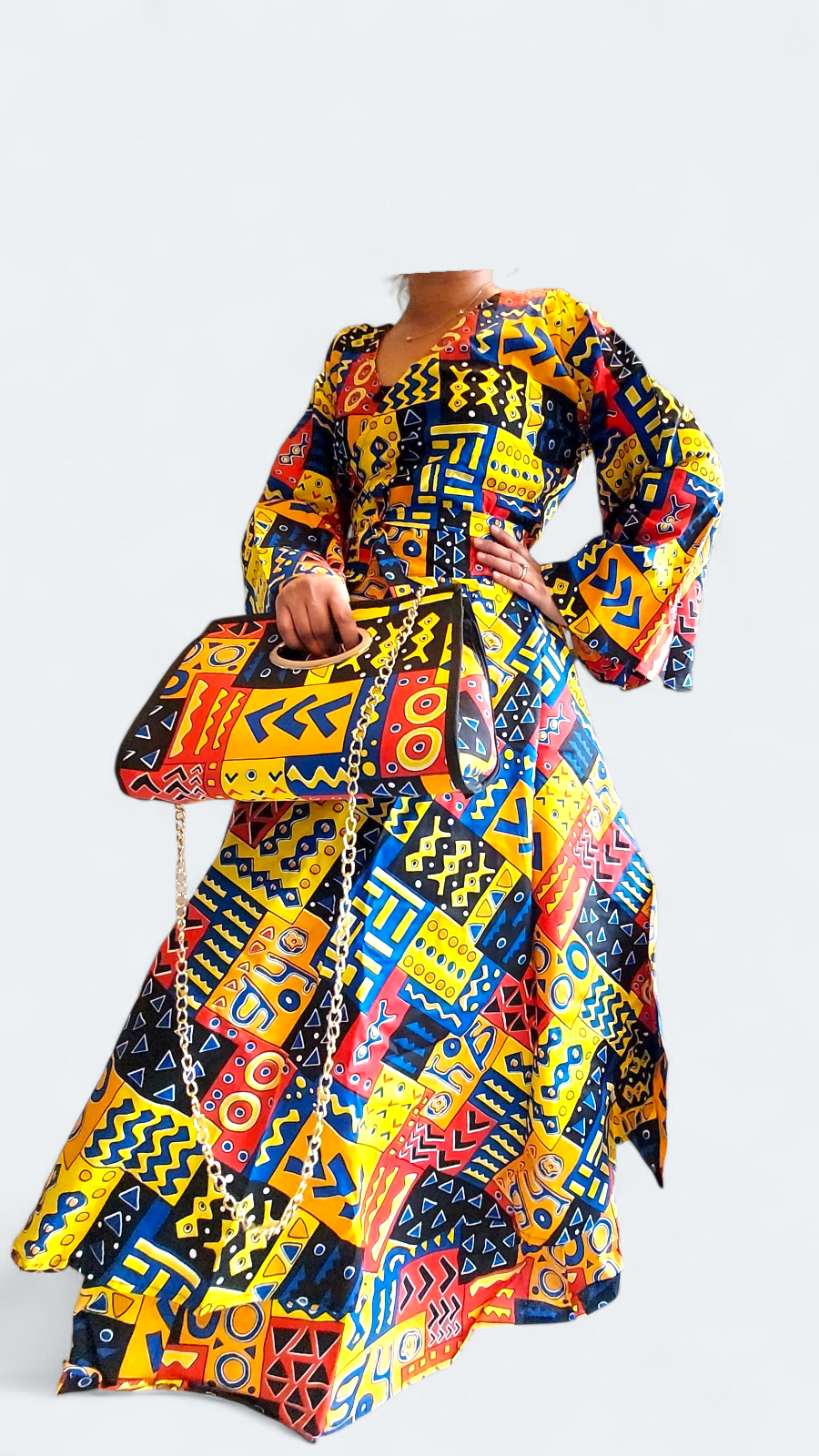 -Woman printed long wrap dress, long maxi skirt and pocketbook are sold as a 3 piece set.